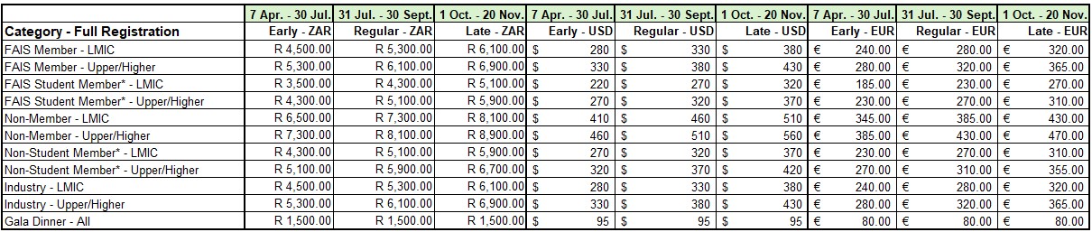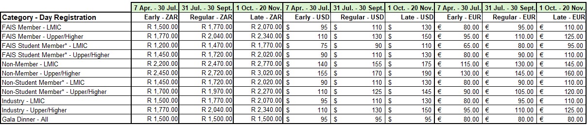 | FAIS Student Member* – LMIC | 2,350.00 | 3,150.00 | 3,950.00 |