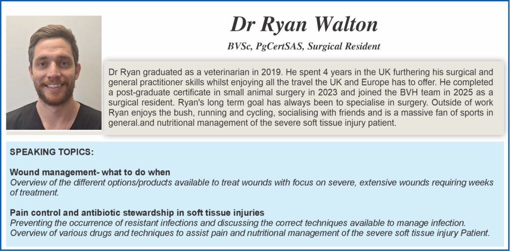 | 11:00 | Wound management- what to do when (Dr Ryan Walton) |